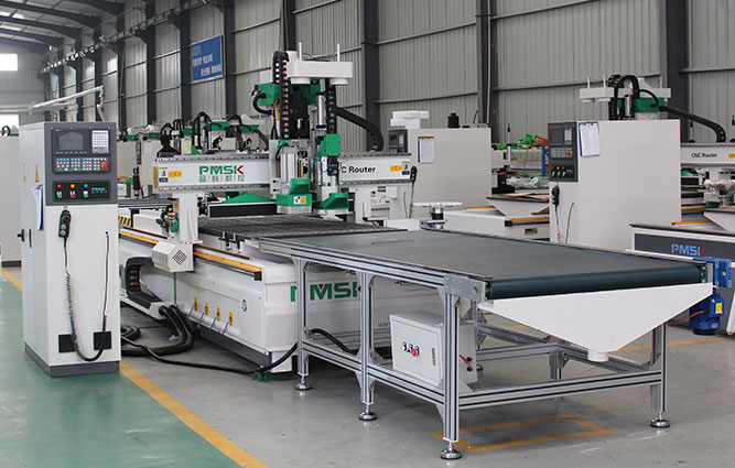 木工加工中心加排鉆是在標準加工中心加排鉆開料機的基礎上增加自動上下料功能,給機器加裝了一套能夠自動抓料的兩個手臂、一個上料放板平臺和自動傳送下料平臺。機器在加工過程中實現(xiàn)自動化加工,為家具廠生產降低了人工勞動強度,提高產量。