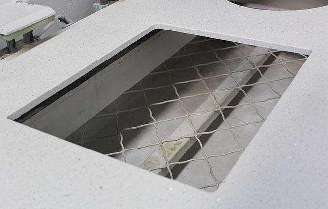 2、 傳送帶自動輸送至適合加工的位置(后側(cè)紅外線為基準),側(cè)推矯正板材自動定位,自動裝夾。無須對原點,只須確定盆孔的位置,開始加工。即:鋸片開孔(方孔),左右兩側(cè)主軸一個修角,一個精磨。